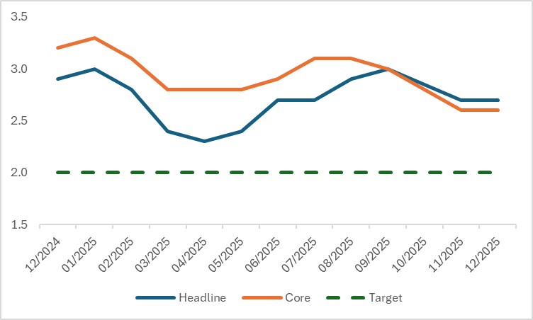 尽管美国当前整体及核心 CPI 仍显著高于 2% 的政策目标,但 2026 年通胀出现大幅反弹的概率较低。我们预计上述两项通胀指标将于本年度内稳定运行在 2.6%-2.8% 区间。我们对通胀不会再度抬头的基准情景判断,主要基于三方面原因: