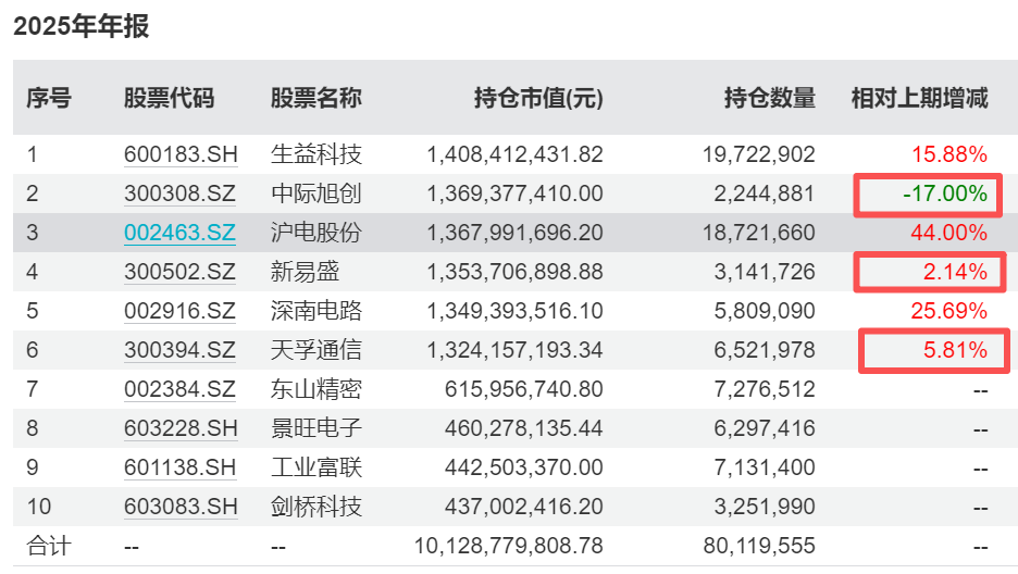 以文章开头提到过的永赢科技智选A为例。季报数据显示,永赢科技智选的股票仓位从94.41%降至80.34%,单季减少超过14个百分点。其中2025年度市场最火热的而算力核心标的“易中天”的配置更为谨慎,如对中际旭创减仓约17%,新易盛和天孚通信仅小幅加仓2.14%、5.81%。