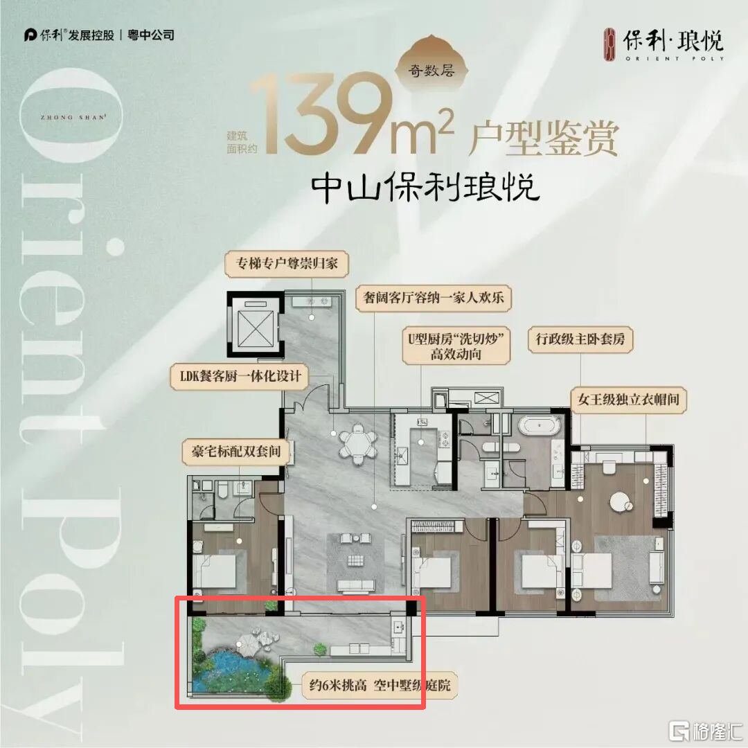 约139平的户型,中山保利琅悦项目的格局上,做到正常的五开间,并且户型内部不会设计过多的飘窗占用卧室空间,阳台、套间卧室以及客厅不会出现错位,阳台约5.1米的开间,套间卧室 客厅的开间也对齐是约5.1米,户型的使用率也卷到了约130%。