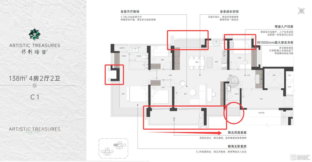 而深圳保利瑧誉项目约138平户型,虽然也是五开间,但5开间中被一个厕所占了一个位置,不仅每个空间都设计了飘窗,卧室、客厅也与阳台错位,无法做到开间对齐,阳台开间比卧室 客厅开间,少了一个飘窗的尺寸。