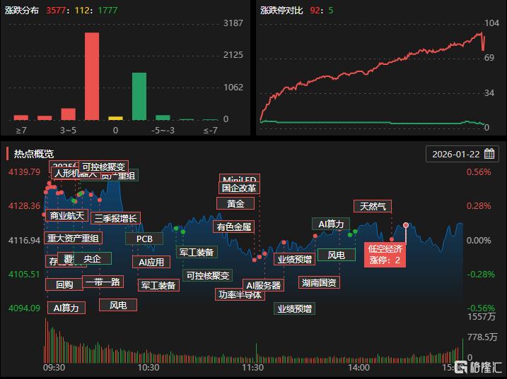 1月22日,沪指涨0.14%报4122点,深证成指涨0.5%,创业板指涨1.01%。全市场成交额2.72万亿元,超3500股上涨。市场热点聚焦商业航天、石油、燃气、煤炭板块。