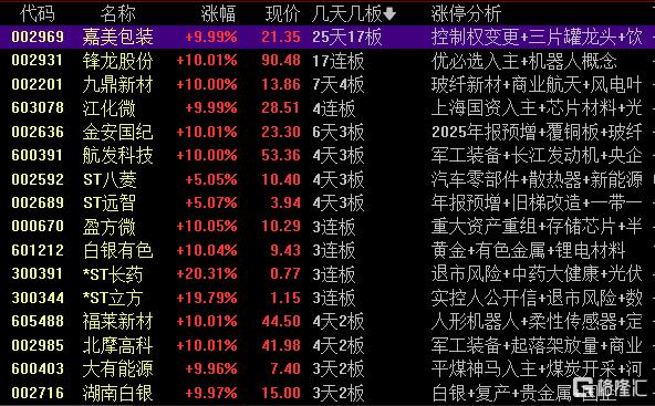 高位股方面,实控人变更的锋龙股份17连板、嘉美包装25天17板、江化微4连板,商业航天概念股银河电子14天8板、巨力索具11天6板、九鼎新材7天4板。
