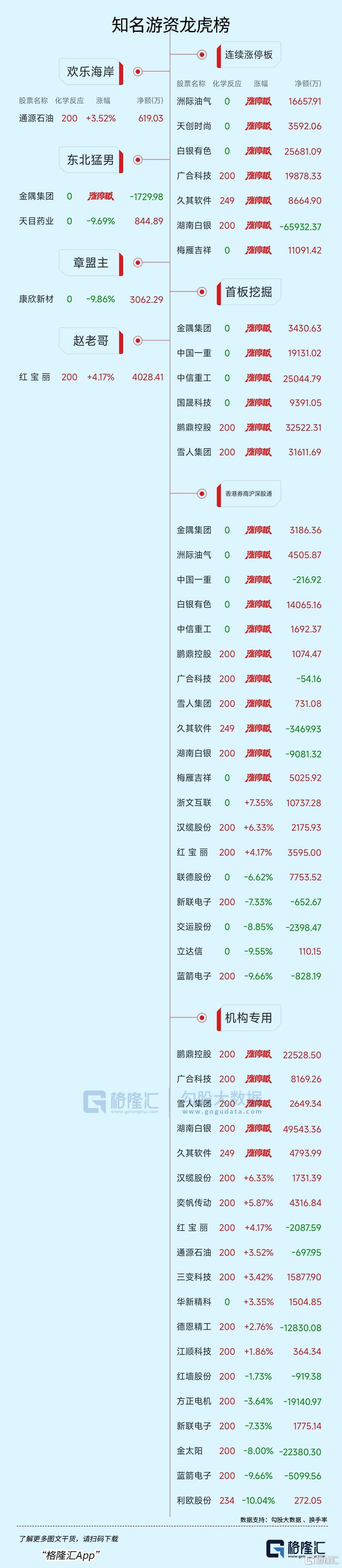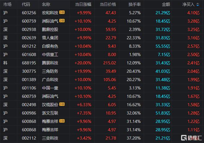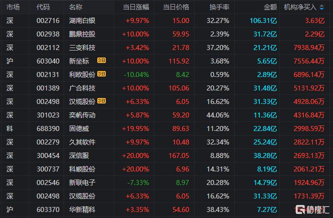 龙虎榜中涉及机构专用席位的个股中,当日净买入额前三为湖南白银、鹏鼎控股、三变科技,分别为3.63亿元、2.29亿元、7938.94万元。