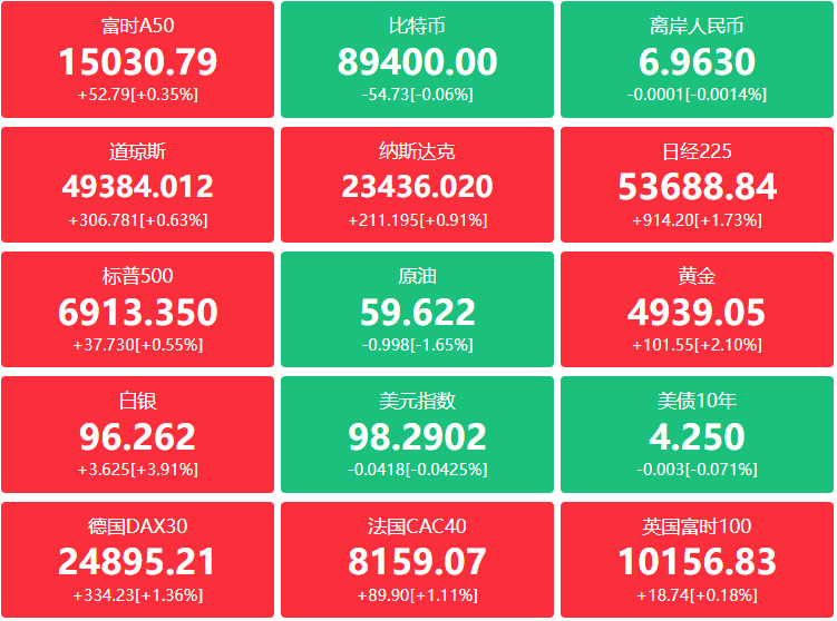 外盘:地缘政治紧张局势降温,同时稳健经济数据以及大型科技股走强,美股集体收涨,其中道指涨306.78点,涨幅0.63%报49384.01点;纳指涨211.20点,涨幅0.91%报23436.02点;标普500涨37.73点,涨幅0.55%报6913.35点;科技股普涨,Meta收涨5.7%创7月31日以来最大单日涨幅;甲骨文涨超2%,AMD、微软、亚马逊涨超1%;特斯拉涨超4%,Lyft跌1.5%,Uber跌2%;中概股多数上涨,纳斯达克中国金龙指数收涨1.59%,阿里巴巴涨超5%,哔哩哔哩涨超4%,理想汽车、京东涨超3%,蔚来涨超2%。