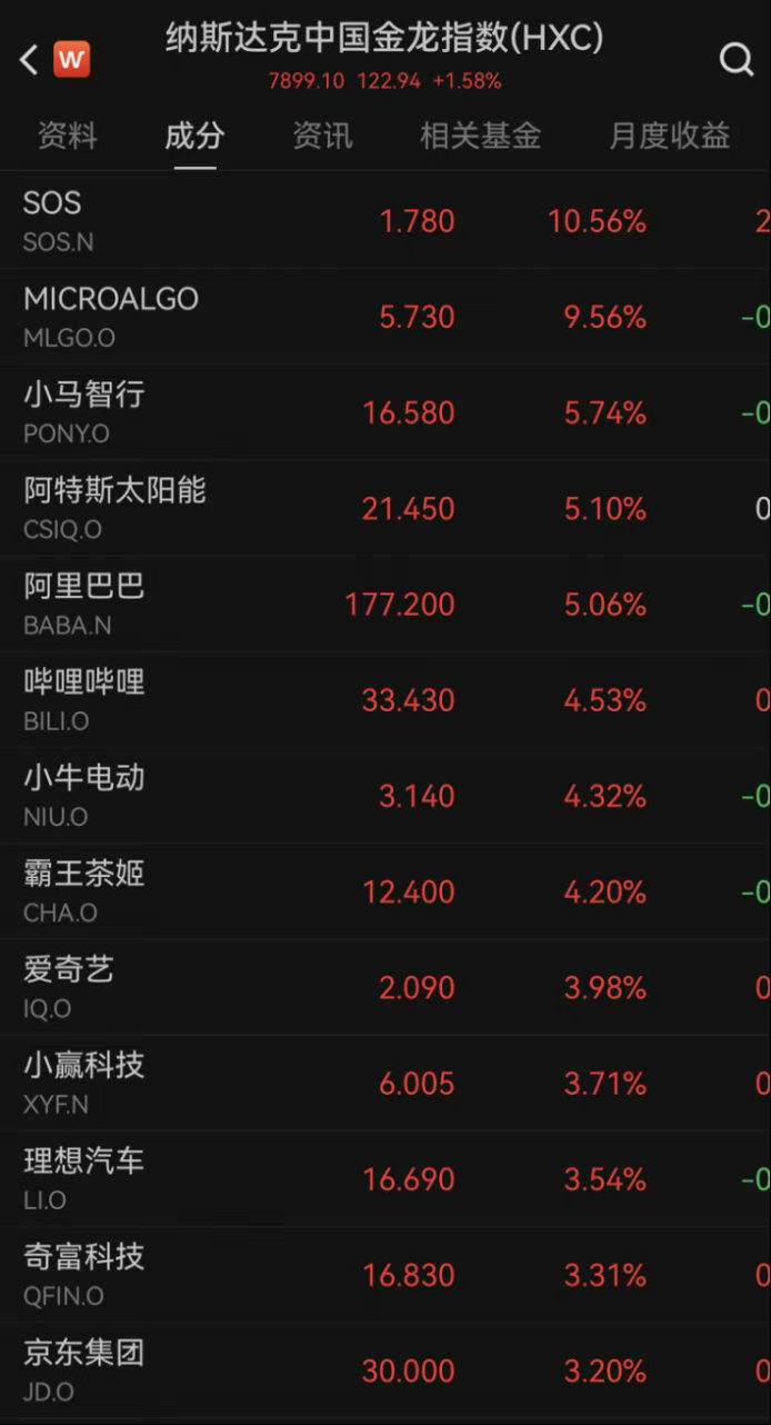 中概股同样迎来普涨行情,纳斯达克中国金龙指数上涨1.58%,万得中概科技龙头指数涨1.09%。个股方面,阿里巴巴涨5.05%,旗下芯片公司平头哥被曝拟独立上市;小马智行涨近6%,阿特斯太阳能涨超5%,哔哩哔哩涨4.53%,理想汽车、京东分别上涨3.54% 和3.20%,蔚来涨2.14%。不过部分中概股表现疲软,小鹏汽车跌2.02%,富途控股跌逾2%,老虎证券跌近5%。