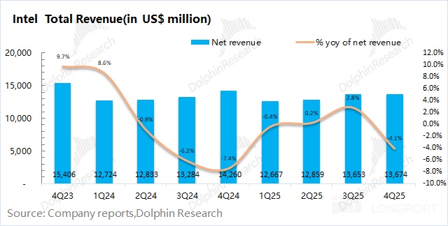 英特尔于北京时间 2026 年 1 月 23 日上午的美股盘后发布了 2025 年第四季度财报(截止 2025 年 12 月),要点如下: