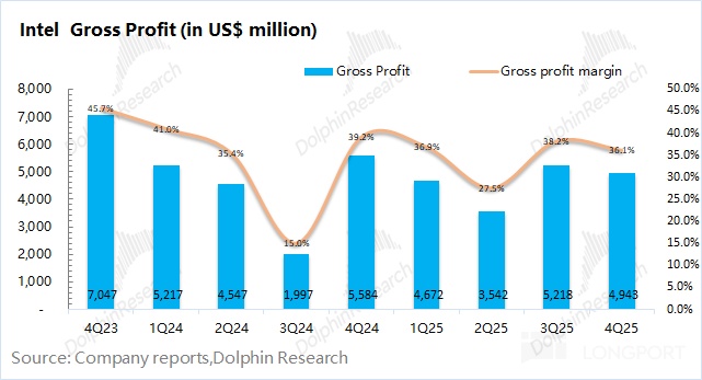 1.4 净利润端:英特尔在 2025 年第四季度净亏损为 5.9 亿美元从经营角度来看,公司本季度经营性利润约为 5.8 亿美元,这更能反映公司真实的经营状况。本季度公司经营端利润环比有所回落,主要是受 18A 量产初期导致毛利率下滑的影响。