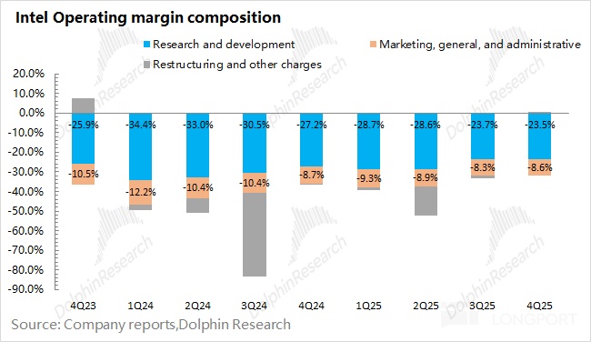 1.3 经营费用端:英特尔在 2025 年第四季度经营费用为 43.6 亿美元,同比下滑 15.6%。公司新任 CEO 定下 “削减成本开支” 的目标后,经营费用也是一个关注点。