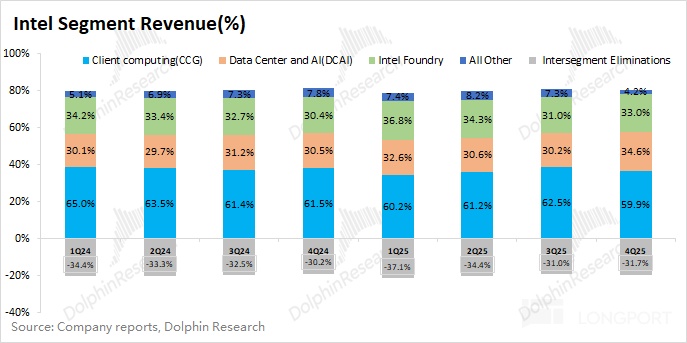 英特尔的客户端收入在 2025 年第四季度实现 81.9 亿美元,同比下滑 6.6%。虽然 PC 市场在本季度仍在回暖,但公司客户端业务表现相对较弱。