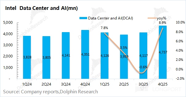 英特尔的数据中心及 AI 收入在 2025 年第四季度实现 47.4 亿美元,同比增长 8.9%,增长主要来自于 AI 服务器相关需求的带动。