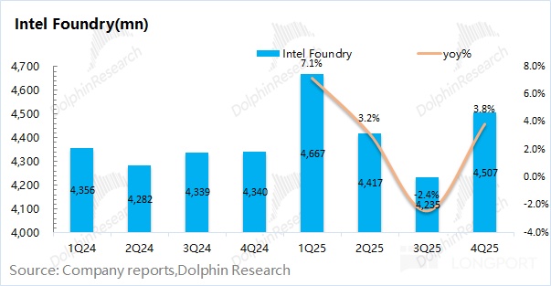 英特尔的晶圆代工业务收入在 2025 年第四季度实现 45 亿美元,同比增长 4%。结合公司本季度的各业务内部的抵消总额也有 43.4 亿美元,可以看出公司当前的晶圆代工基本都是对内服务,对外代工收入极少