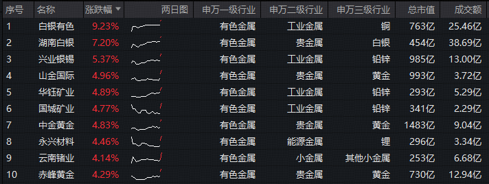 成份股方面,白银有色涨超9%,湖南白银涨逾7%,兴业银锡涨超5%,山金国际、华钰矿业涨超4%。权重股方面,山东黄金涨超3%,紫金矿业涨逾1%,洛阳钼业、北方稀土飘红。
