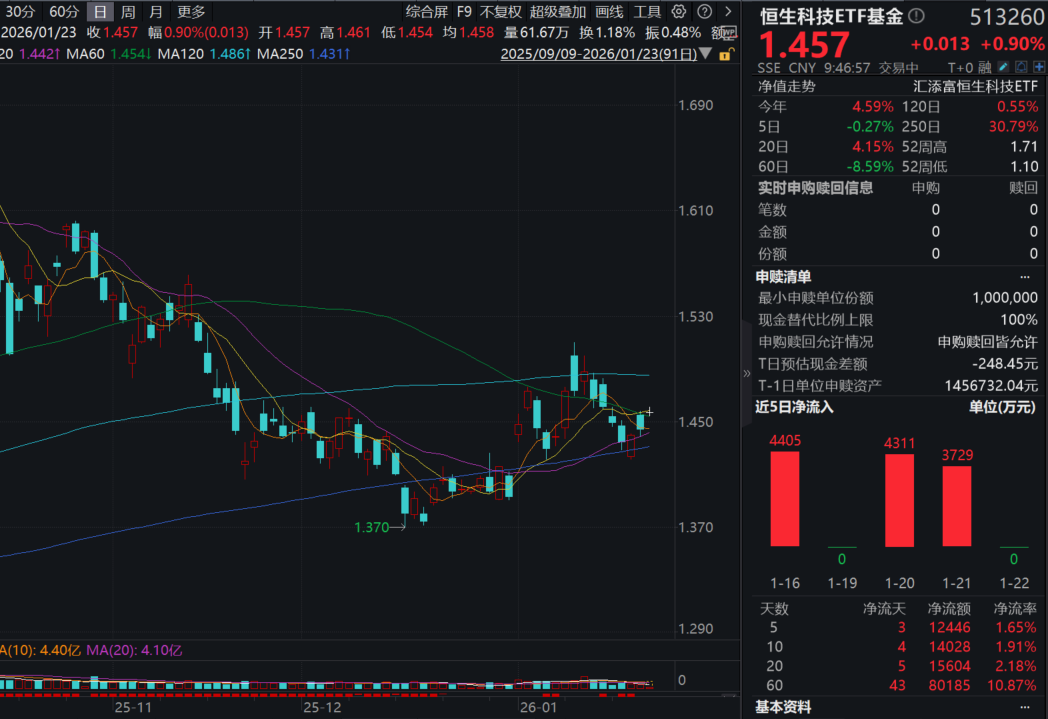 今日(1.23),港股科技再度飘红,100%纯度的港股通科技30ETF(520980)涨近1%,成交额逼近1亿元!资金已连续3天大幅涌入,累计“吸金”超4.8亿元!