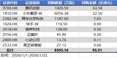 回购方面,小米集团启动最高25亿港元自动股份购回计划。1月22日晚在港交所发布公告称,公司于2026年1月22日与一家独立经纪商订立协议,据相关安排,经纪商将依据经纪协议中明确的预定参数,在香港联合交易所有限公司展开操作,购回公司不超过25亿港元的B类普通股。