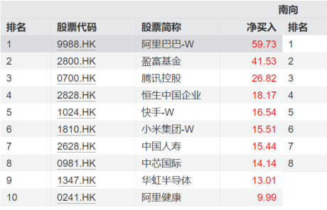 南向资金持续涌入港股。近七日以来,阿里巴巴-W以超59亿港元的净买入位居榜首,腾讯控股、快手-W、小米集团-W、中芯国际、华虹半导体、阿里健康也均位于净买入榜前十。