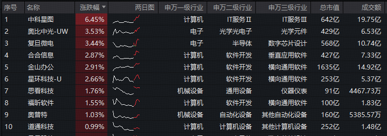成份股方面,软件龙头显著领涨,中科星图领涨超6%,合合信息、金山办公涨逾2%。此外,奥比中光、复旦微电涨超3%,思看科技、奥普特涨逾1%。另一方面,半导体龙头跌幅居前,芯原股份、澜起科技跌逾4%,拖累指数表现。