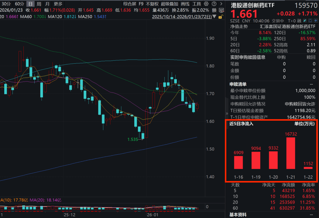 今日(1.23),港药强势反攻,创新药纯度100%的港股通创新药ETF(159570)涨近2%,成交额快速突破7亿元!资金面上,近5日累计净流入超4.3亿元!最新规模超251亿元,同类规模领先!