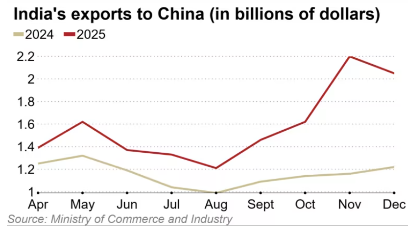根据印度商务和工业部的数据,截至本财年(自去年4月开始)的前九个月,印度对中国的商品出口同比增长36.7%,达到142.5亿美元。仅在12月,出口额就同比增长68%,达20.5亿美元。