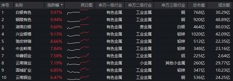 成份股方面,白银有色、铜陵有色涨停,湖南白银、兴业银锡涨逾9%,驰宏锌锗、中金岭南、华峰铝业等个股大幅跟涨。权重股方面,山东黄金涨超2%,洛阳钼业涨逾1%,紫金矿业、中国铝业、北方稀土飘红。