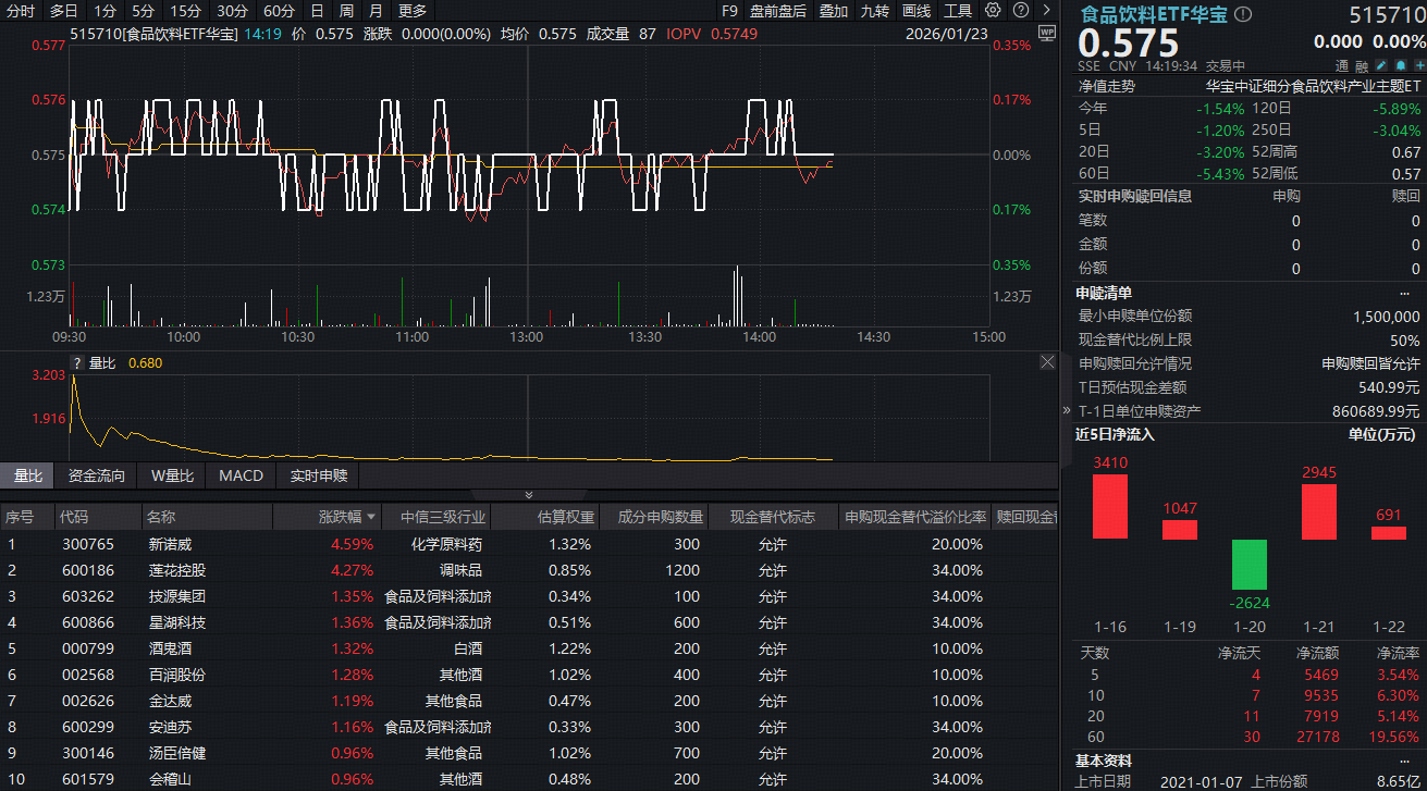 1月23日,吃喝板块震荡盘整,反映吃喝板块整体走势的食品饮料ETF华宝(515710)全天于水面附近震荡。成分股方面,大众品涨幅居前。截至发稿,莲花控股大涨超4%,星湖科技、酒鬼酒、金达威等多股涨超1%;下跌方面,部分白酒股表现不佳,截至发稿,山西汾酒、洋河股份等小幅飘绿,拖累板块走势。
