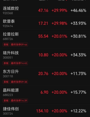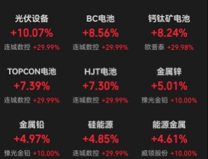 BC电池、钙钛矿电池、HJT电池、TOPCon电池等细分板块也纷纷强势上攻,拉普拉斯、东方日升、奥特维、赛伍技术等批量涨停。此外做多热情向新能源其他方向传导,风电设备、储能、能源金属、可控核聚变等新能源领域集体上涨,明阳智能、三变科技、拓日新能、金风科技等纷纷涨停。