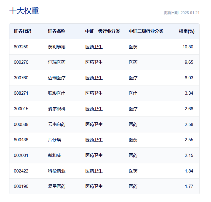 资料显示,医药ETF(159929)所跟踪的中证医药卫生指数(000933)全面覆盖医药板块细分领域。数据显示,截至2026年1月21日,中证医药卫生指数(000933)前十大权重股合计占比44.38%。