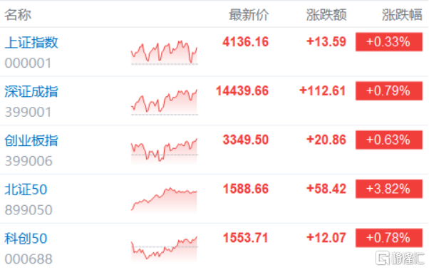 1月23日,A股三大指数集体上涨,截至收盘,沪指涨0.33%报4136点,深证成指涨0.79%,创业板指涨0.63%,北证50指数涨3.82%。全市场成交额3.12万亿元,较前一交易日增量4017亿元,超3900股上涨,超百股涨停。