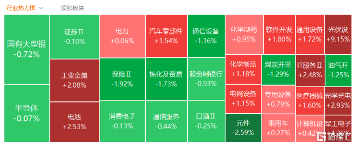 盘面上,光伏设备板块大爆发,隆基绿能、捷佳伟创及晶科能源等二十余股涨停;HIT电池、钙钛矿电池板块跟涨,东方日升20CM涨停;商业航天板块持续走高,航天电子、中国卫星等十余股涨停;锂矿概念拉升,大中矿业涨停;有色金属板块、培育钻石、玻璃基板及6G概念等涨幅居前。另外,银行、保险股走低,中国太保领跌;粮食概念走弱,*ST万方跌停;CPO概念走势低迷,新易盛跌逾6%;乳业、航空机场、煤炭及燃气等板块跌幅居前。