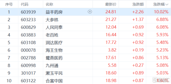 医药商业板块上涨,益丰药房涨停,大参林、人民同泰涨超6%,润达医疗、九州通等多股跟涨。