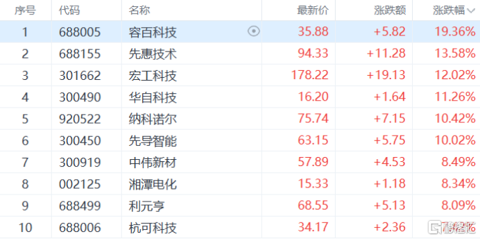 电池板块走强,容百科技涨超19%,先惠技术、宏工科技、先导智能等多股跟涨。