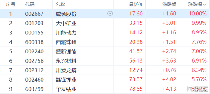 锂矿板块上涨,大中矿业涨停,川能动力涨超8%,西藏珠峰、盛新锂能、永兴材料等多股跟涨。