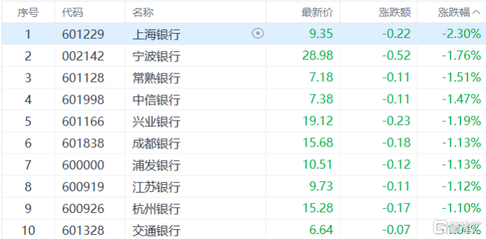 银行板块下跌,上海银行跌超2%,宁波银行、中信银行、兴业银行等多股跟跌。