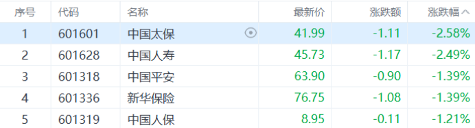 保险板块下挫,中国太保领跌,中国人寿、中国平安、新华保险等多股跟跌。