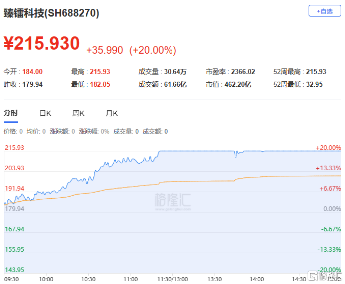 臻镭科技涨停,报收215.93元。消息面上,2026北京商业航天展将召开,爱建证券预判2026年为行业景气元年,规模化发射与回收验证启动。