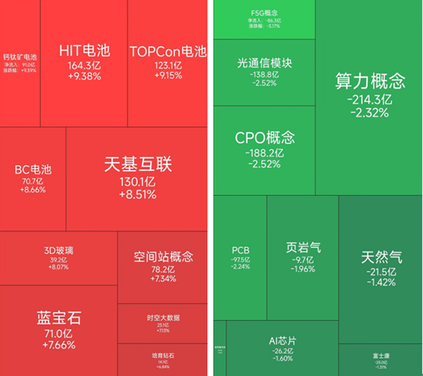 1月23日,A股三大指数集体上涨。截至收盘,沪指涨0.33%报4136.16点,深成指涨0.79%报14439.66点,创业板指涨0.63%报3349.5点。从板块行情上来看,今日表现较好的是HIT电池、天基互联和空间站概念,而算力概念、CPO概念和天然气等板块下跌