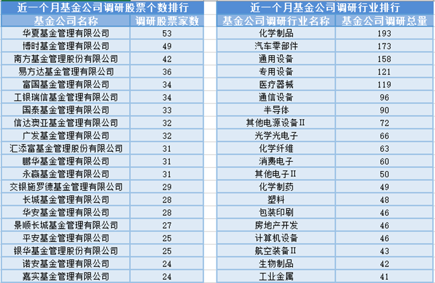 近一个月(12月24日-1月23日),华夏基金参与公司调研的数量最多,共调研53家上市公司,此外调研较为活跃的还有博时基金、南方基金和易方达基金,分别调研49家、42家、36家上市公司;从调研行业上来看,基金公司对化学制品行业的上市公司调研次数最多,共有193次,其次是汽车零部件行业,基金公司调研了173次。