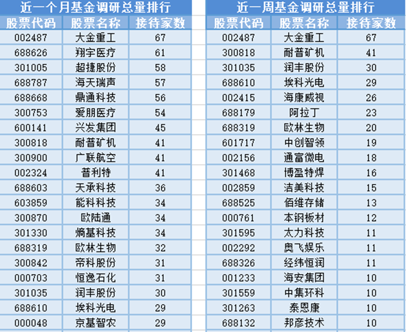 将时间周期缩短到最近一周(1月16日-1月23日)来看,基金调研数量第一的公司是大金重工,大金重工属于金属制品行业,主营业务为生产销售海上风电单桩基础、过渡段、导管架、浮式基础以及塔筒产品,为客户提供海上风电装备的“建造 运输 交付”一站式综合解决方案,可满足全球不同地区海上风电项目的多样化需求。大金重工共被67家基金机构调研,其次被调研数量较多的股票是耐普矿机、润丰股份和埃科光电,分别接受41家、30家和29家基金机构的调研。