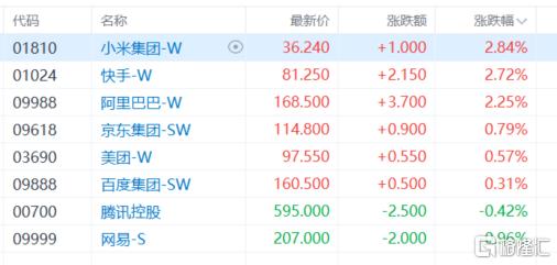权重科技股多数上涨,小米集团、快手涨近3%,阿里巴巴涨超2%,京东、美团、百度微涨;腾讯控股、网易小幅下跌。