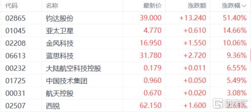商业航天板块涨幅居前,钧达股份涨超51%,亚太卫星、金风科技、蓝思科技、航天控股等跟涨。