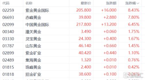 黄金股继续走强,紫金黄金国际涨超8%,赤峰黄金、中国黄金国际、潼关黄金、灵宝黄金、山东黄金、紫金矿业等跟涨。