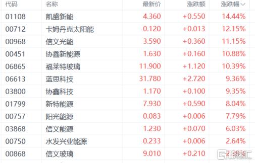 光伏股拉升,凯盛新能涨超14%,信义光能、协鑫新能源、福莱特玻璃、蓝思科技、协鑫科技、新特能源、阳光能源等跟涨。