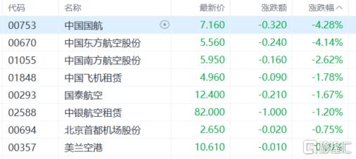 航空股全线下跌,中国国航、中国东方航空股份、中国南方航空股份、中国飞机租赁、国泰航空、北京首都机场股份等跟跌。