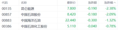 石油股走低,昆仑能源、中国石油股份跌超2%,中国海洋石油、中国石油化工股份等跟跌。