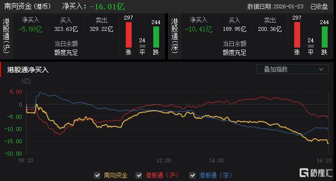 今日,南向资金净卖出16.01亿港元,其中港股通(沪)净卖出5.6亿港元,港股通(深)净卖出10.41亿港元。