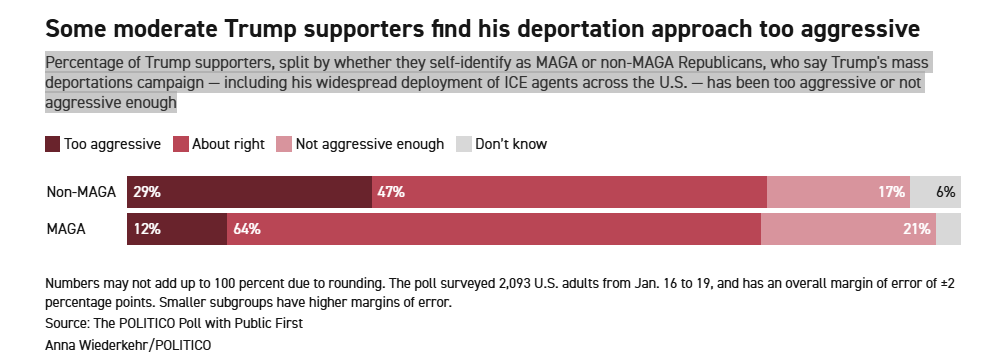 大多数特朗普支持者确实支持他的大规模驱逐行动,politico与Public First联合的民调显示,55%的受访者认为,包括在全美部署大量移民执法局探员在内的做法“恰到好处”。但在2024年的特朗普选民中,那些不认同“MAGA”标签的温和派存在明显分歧:29%认为政策过于激进,17%认为还不够激进。