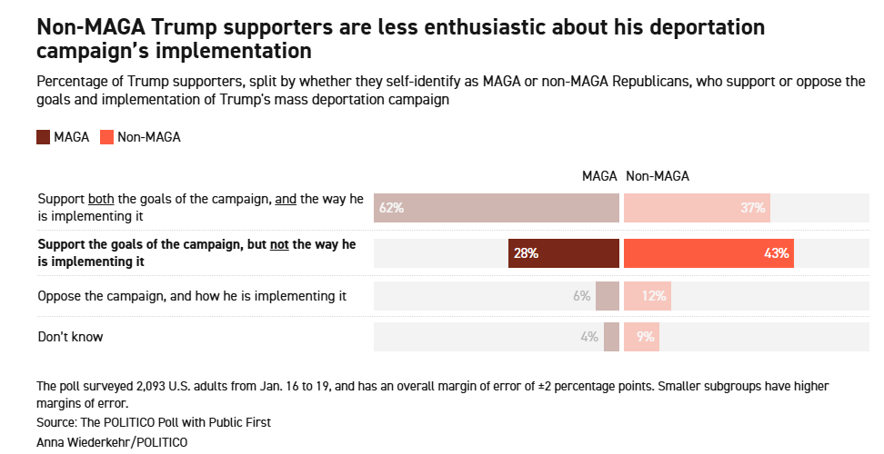 在非MAGA的特朗普选民中,有43%表示支持政策目标但不认同执行方式,而在MAGA群体中,这一比例为28%。