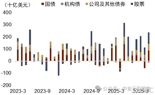 我们测算了VIX指数与美元指数近期的日内相关性,发现在1月20日美指与VIX指数呈现统计学上显著的负相关性(图表1)。我们认为这体现出在特朗普对欧洲各国发出关税威胁后,美元与美股的市场情绪再度转为负相关,市场“卖出美国”交易或明显升温。为考察此次事件后续短期内对美元资产的影响,我们回顾了2025年4月的“解放日”事件,彼时亦出现美股与美元同步下跌的情形。我们构建了美国与主要非美国家的短期利差,作为影响美元的周期性因素,以研究市场“卖出美国”等结构性因素对美元的影响。基于2021年底至2024年数据训练后的模型,我们利用利差预测了2025年至今美元指数的走势(图表2)。我们发现,2025年4月“解放日”后美指的下跌幅度明显超过了利差所隐含的水平,不过随着相关风险的消散,美元指数的偏离在2025年11月后基本消失,重新回归到利差所隐含的水平。TIC数据亦显示,2025年4月外资明显卖出美国资产,不过在此后整体恢复了净流入,不过2025年10月外资再度卖出美国的长端国债(图表3)。因此,参考2025年4月“解放日”的经验,我们认为近日格陵兰岛事件对美元汇率或偏向于一次性冲击,随着相关风险的降温,美元指数或有望逐步回升至利差等美国基本面所隐含的水平。
