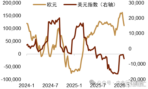 特朗普政府所挑起的地缘风险可能在长期内强化市场弱美元的预期,并反过来促使市场卖出美元资产,并增加美元的对冲需求。从近期的跨境资金来看,EPFR数据显示,欧洲上周或明显卖出了美国的股票与债券等资产(图表4)。从更广泛的美债的持有情况来看,相较2024年末,截至11月,2025年外资持有的美债增加约7,361亿美元,其中欧洲、加拿大分别增加约4,320亿美元和935亿美元,合计贡献了71.4%的比例(图表5)。考虑到近期遭到特朗普政府针对的欧盟各国、加拿大等均是美国的传统盟友,我们认为若美国与上述国家的矛盾在长期继续发酵,可能令欧盟、加拿大等国购买美债的意愿产生负面影响,存量美债也可能被重新配置,进而动摇美债作为储备资产的地位。从外汇对冲角度来看,2025年4月至今,美元指数的非商业期货净头寸已持续录得负值,与此对应的,欧元净头寸则升至较高的水平(图表6)。