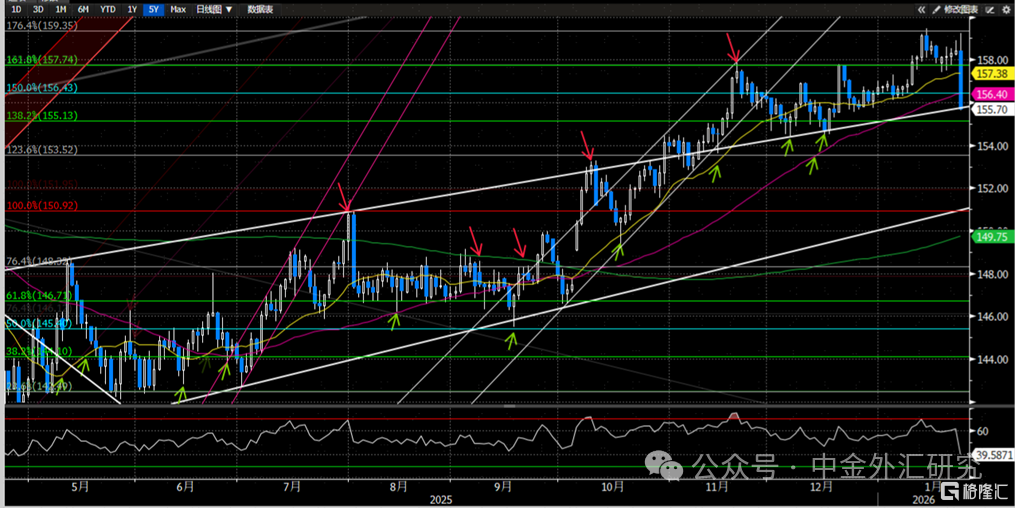 美元/日元上周冲高回落,走势完全符合我们此前一周给出的下跌判断:上周周中美元/日元一度上测了1月中旬的前高159.30附近,而后出现大幅下行,并且收盘于55天均线156下方(图表19中粉色线)。本周多空双方争夺的焦点下移至55天均线156.40附近,如果美元多头不能收复这一近期阻力,那么价格依旧有下行的风险,尤其如果美元/日元跌破去年5月以来的上升趋势线支撑(图表19中靠上方的白色加粗线),而美元空头近期的下一个目标可能位于154附近。