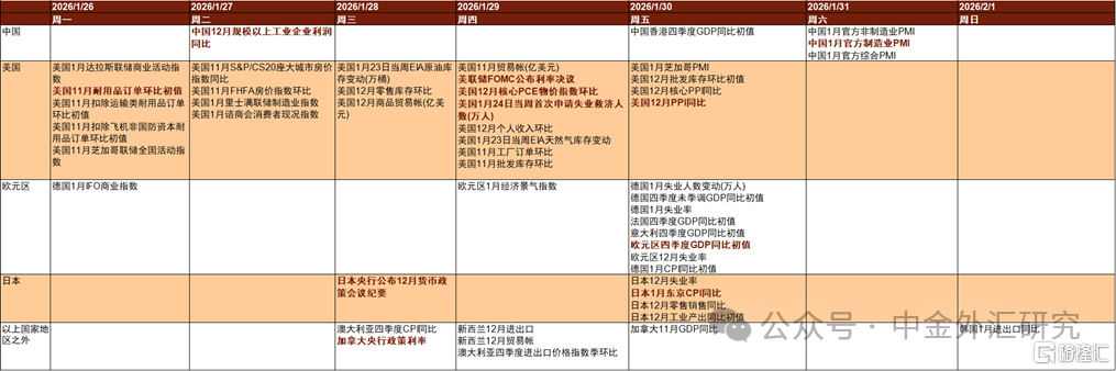 本周市场将重点关注美联储1月FOMC会议,虽然我们认为美联储会按兵不动,但其有关美国劳动力市场以及通胀的最新判断可能会对市场对未来的降息预期产生关键影响。另外,美国对格陵兰政策的最新进展同样值得关注。上周过后,我们依旧认为美元会继续其在中长期维度上的下行压力,尤其如果此后美国劳动力市场再次走弱。